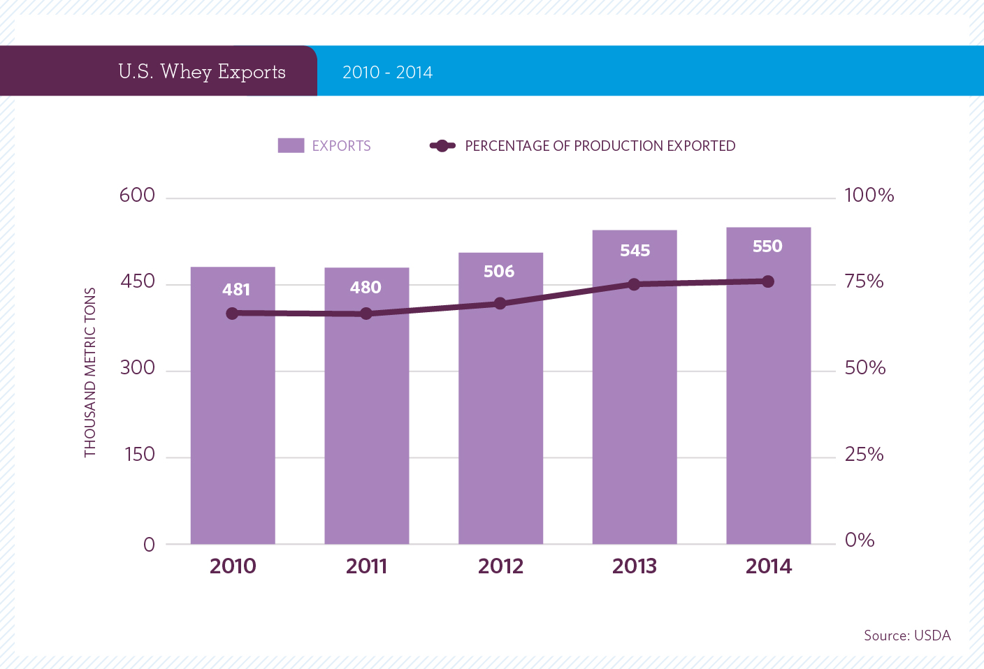Estados Unidos es el único exportador más grande de productos de suero lácteo en el mundo. Los niveles de exportación han crecido hasta alcanzar aumentos sin precedentes de más del 70 % de la producción deseada para los mercados extranjeros. El Consejo de Exportación de Lácteos de Estados Unidos y la industria de suero lácteo estadounidense están equipados para los negocios acelerados actuales, enfocados en el futuro y deseosos de proveer a clientes de todo el mundo como sus socios comerciales.