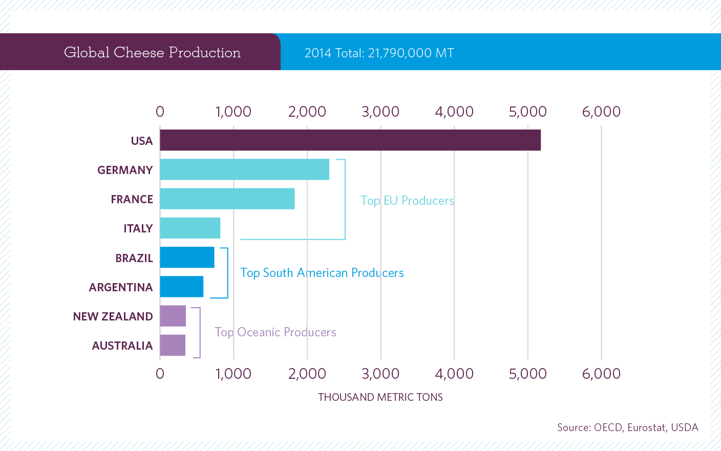 世界のチーズの 4 分の 1 近くが米国で生産され (2014 年の生産量は 510 万トン以上)、その生産量は増加しています。世界最大の牛乳供給量、豊富な土地、研究と技術への投資が、米国チーズ産業がとどまることなく成長し、顧客要求に応えることを可能にしています。