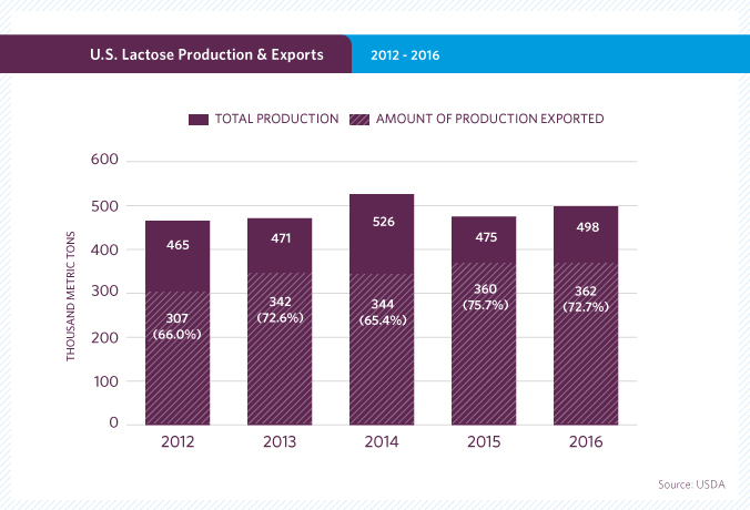 미국은 연간 유당 생산량에 있어 세계 최고이며, 증가하는 세계 수요를 충족시키기 위한 지속적으로 잠재적인 성장 역량을 갖추고 있습니다. 2014년 미국의 유당 생산량은 526,000미터톤에 달했는데, 이는 2010년 412,000미터톤보다 28% 늘어난 수치입니다. 미국은 단일 국가로서 2013년 세계 생산량의 40% 이상을 차지했습니다. 이는 미국의 강점 그리고 향후에도 품질 좋은 유당을 공급할 수 있는 안정적인 파트너가 될 수 있는 잠재력이 반영된 것입니다.