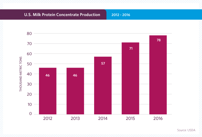유단백 원료는 미국 유제품 원료 분야에서는 비교적 새로운 요소로, 2000년에야 농축유단백(MPC)이 처음 배합되었습니다. 최근 들어 미국의 원료 가공업체들은 유단백질 생산을 더욱 전문화해 왔습니다. 예를 들어 미국 내 농축유단백의 생산량은 2014년에 57,000톤으로, 2010년보다 41%나 증가해 사상 최고치를 기록했습니다. 미국 MPC 수출도 또한 성장세를 보이며 2014년에는 전년도 대비 69% 증가하여 52,000톤에 이르렀습니다.