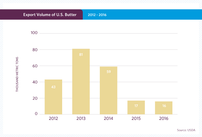 The United States dairy fat industry recognizes that the international marketplace offers an attractive channel to expand sales and is eager to deliver quality products that meet requirements and process needs of customers around the world. In 2016, U.S. butter exports reached 16,000 metric tons. Despite a decrease in exports compared to previous years, the industry remains committed to being a preferred supply partner for years to come.