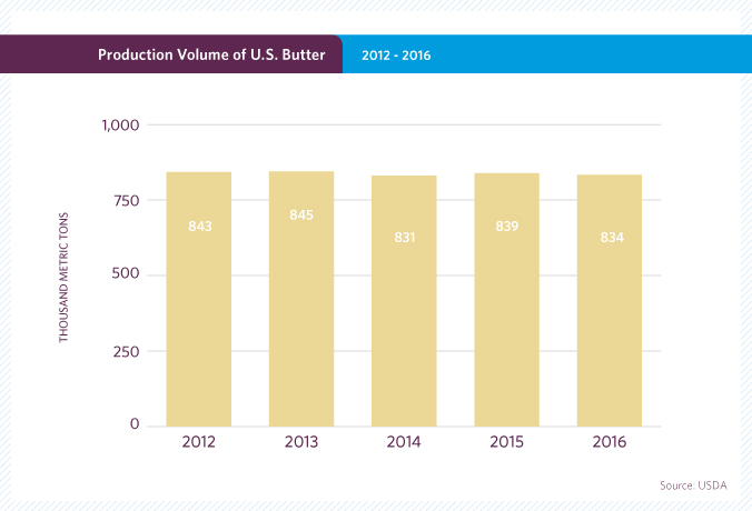 With an ample rising milk supply and year-round butter production, the United States has expanded its annual butter output by 50 percent over the last decade. U.S. butter production rose to 834,000 metric tons in 2016, up 21% from 2010, though production has been stable in recent years. The United States capitalizes on its expertise in information technology at the farm level to maintain a strong commitment to a growing butter supply.