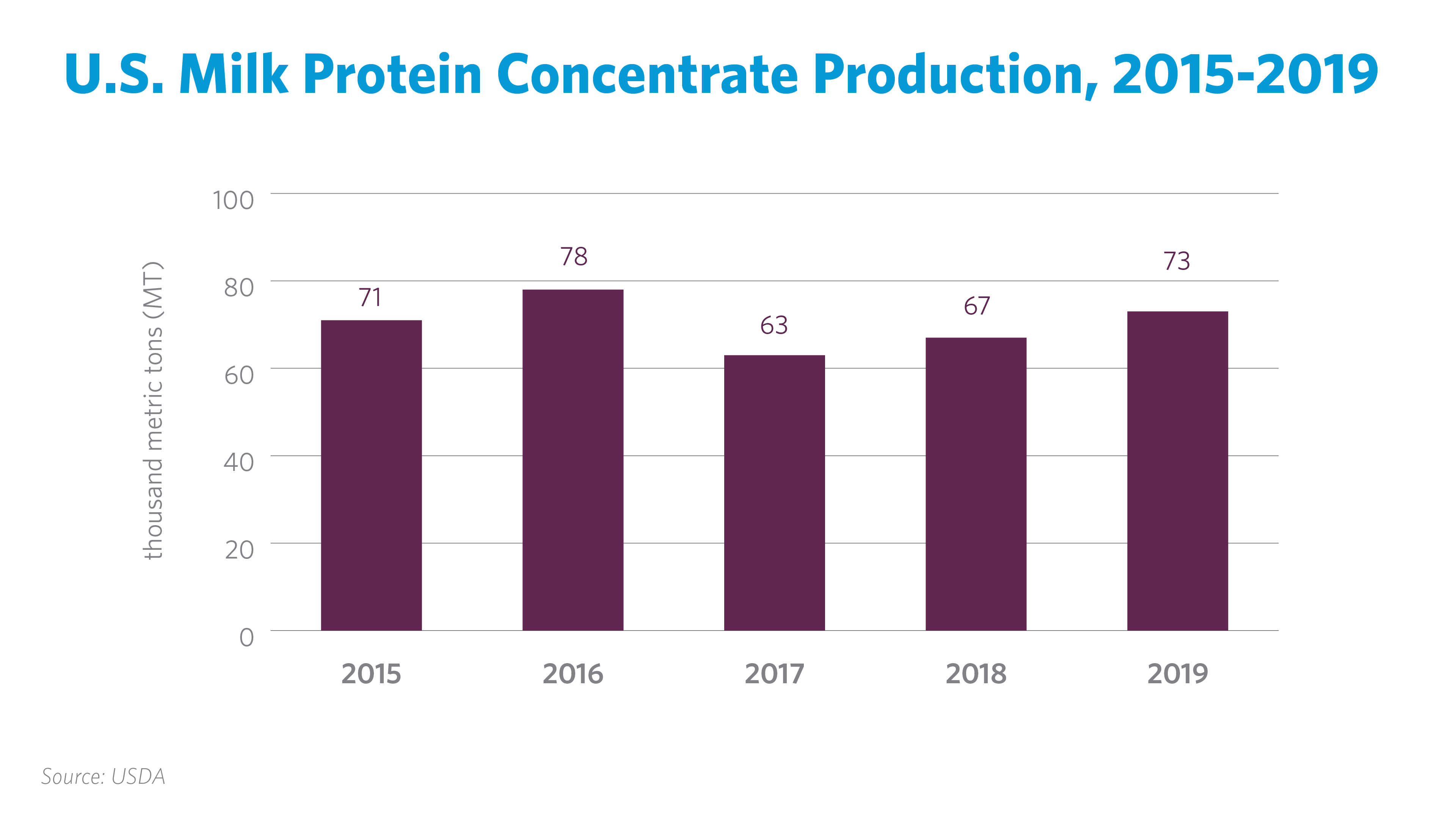 Milk protein ingredients are relatively new to the U.S. dairy ingredient world, with the first mik protein concentrate (MPC) manufactured in 2000. In recent years, U.S. ingredient processors have become increasingly specialized in the production of milk proteins. Domestic milk protein concentrate production, for example, has reached a new record of 78,000 metric tons in 2016, up 70% from 2012.