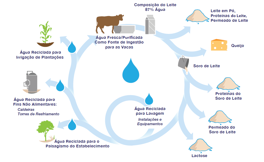 A preservação da água é uma parte essencial do processamento. Nas fazendas leiteiras, a água é reutilizada de diversas formas- desde a utilização nas tubulações para auxiliar no resfriamento do leite, na lavagem dos celeiros como parte da limpeza e irrigação das plantações. E como cerca de 87% do leite é água, com a ajuda de novas tecnologias, os processadores também encontram formas de recuperá-la e reutilizá-la, quando a fabricação do queijo e a secagem do leite em pó estiverem completas.