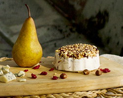 Rising Sun Farm's Gorgonzola Cheese Torta features ruby red dried cranberries and chopped hazelnuts over a creamy off-white base with pieces of pear and cranberry and flecks of blue cheese. Its cream cheese flavor is rich and buttery with pungent gorgonzola blended with sweet pears and tangy cranberries, with a finish of smoky notes of toasted hazelnuts.