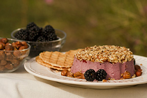 Rising Sun Farm's Marionberry Cheese Torta has a sweet and tangy mix of apricot and Marion Blackberry. Blended from cream cheese, it is thick, smooth, and creamy with a pale purple appearance with specks of cranberry and apricot.