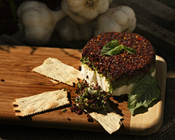 Rising Sun's Pesto Dried Tomato Torta has a base layer of creamy white cheese, followed by a layer of green pesto, and topped with a layer of deep red tomato pieces. It has full-bodied parmesan overtones blended with the sweetness of basil and a hint of garlic. Thick, smooth and creamy with small bits of tender/chewy tomato. Low sodium and naturally gluten-free.