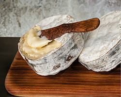 Harbison is named for Anne Harbison, affectionately known as the grandmother of Greensboro. Along with breathtaking views, traditions and people are part of what makes Vermont's working landscape special, and Jasper Hill Farm is proud to honor Ms. Harbison's contribution with this cheese. Harbison is a soft-ripened cheese with a rustic, bloomy rind. Young cheeses are wrapped in strips of spruce cambium, the tree's inner bark layer, harvested from the woodlands of Jasper Hill. The spoonable texture begins to develop in the vaults, though the paste continues to soften on the way to market. Harbison is woodsy and sweet, balanced with lemon, mustard, and vegetal flavors. This cheese is a great excuse to gather a few friends and scoop into a decadent treat. When a bit younger, the bark can be peeled away for sliced portioning. If the bark has fused with a more loosened paste, then the best approach is to leave the bark intact and spoon out portions from the top. Pair with oaked white wine, or barrel-aged sour beer. Fruit mostarda and crusty bread make nice accompaniments.