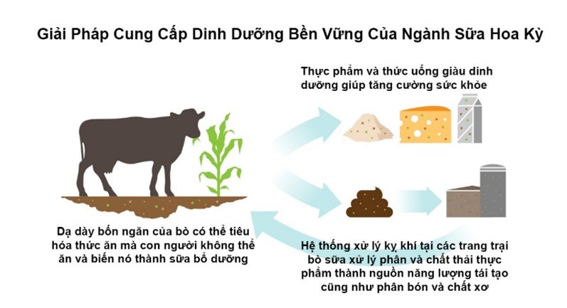 Để tối đa hóa dinh dưỡng, bò sữa Hoa Kỳ có chế độ ăn được thiết kế đặc biệt để cung cấp dinh dưỡng tối ưu đồng thời mang lại lợi ích trên toàn chuỗi thức ăn. Bò có khả năng ăn thức ăn mà con người không thể tiêu hóa, như các sản phẩm phụ từ chế biến thực phẩm như vỏ của các loại quả có múi và vỏ hạnh nhân, giảm thiểu chất thải liên quan đến sản xuất thực phẩm.